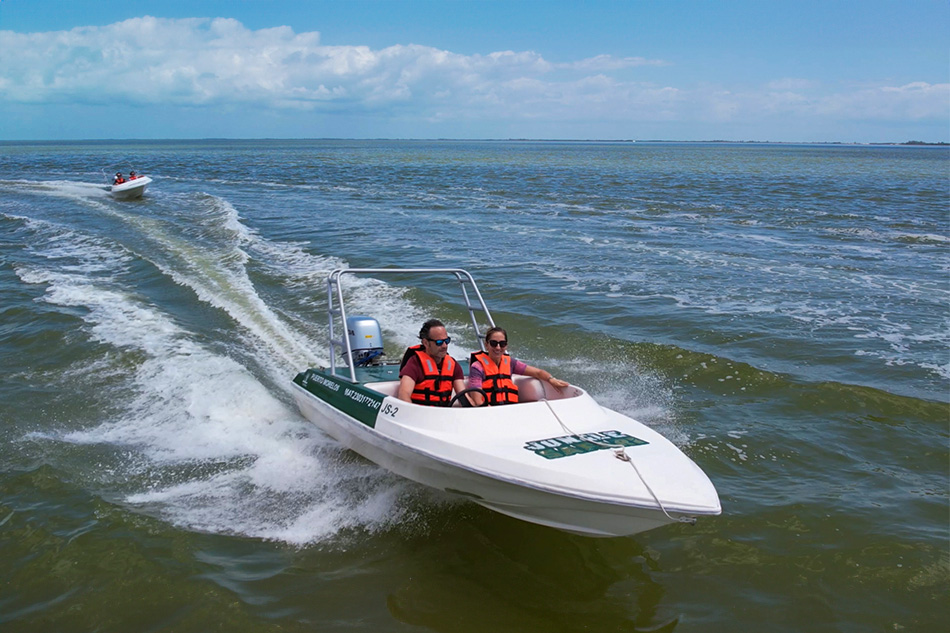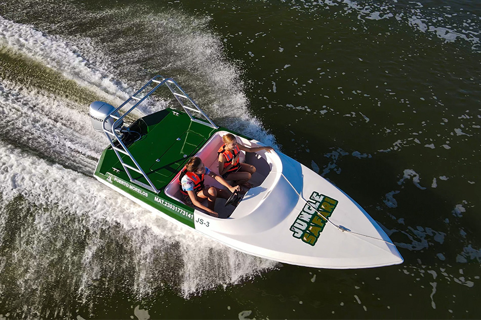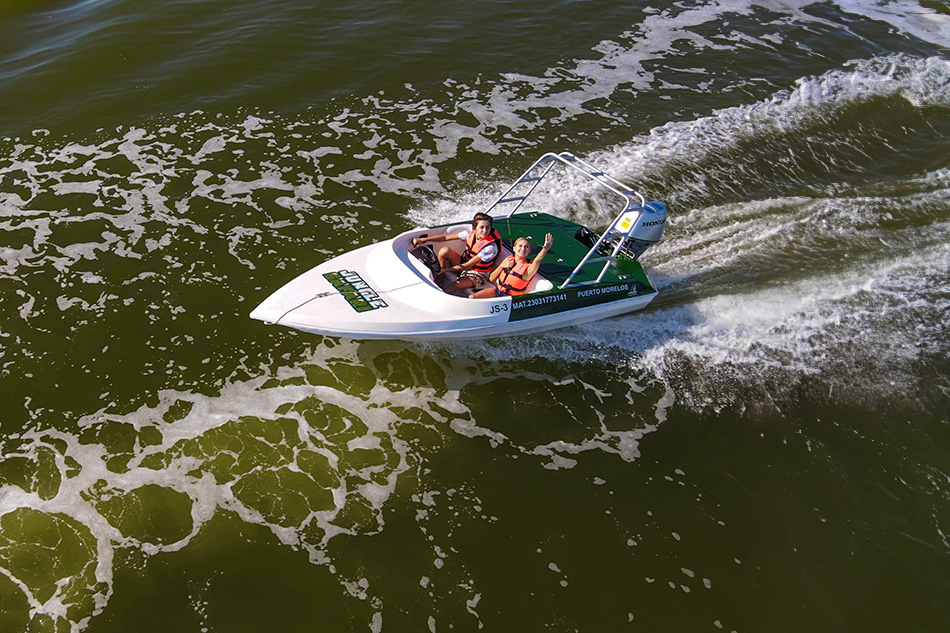 Live a unique experience sailing through the Chacmuchuc Lagoon, one of the most beautiful and preserved ecosystems on the northern coast of Quintana Roo. Aboard modern two-seater speed boats, you will travel through the narrow natural channels that wind through mangroves and discover the perfect balance between adrenaline and nature.